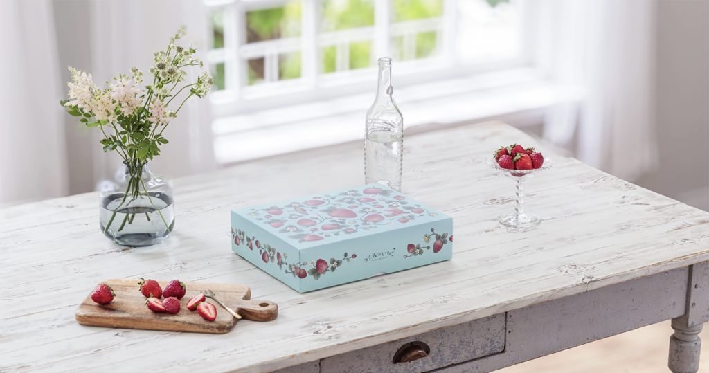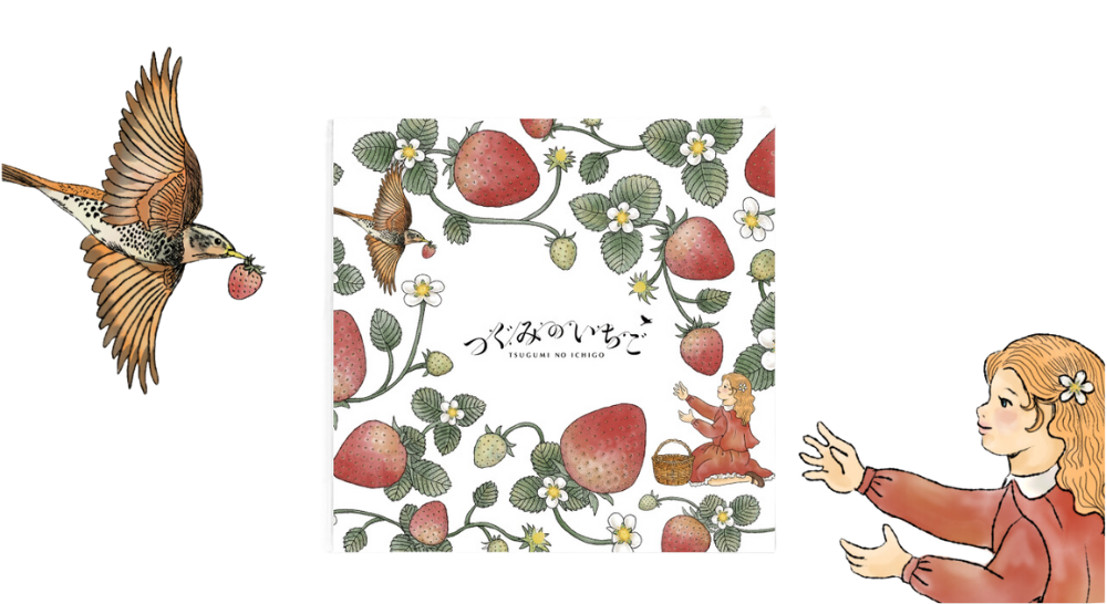 「つぐみのいちご」のパッケージには、いちごが大好きな女の子のもとへ、よく熟れた果実を運ぶ優しいつぐみの姿が描かれています。
